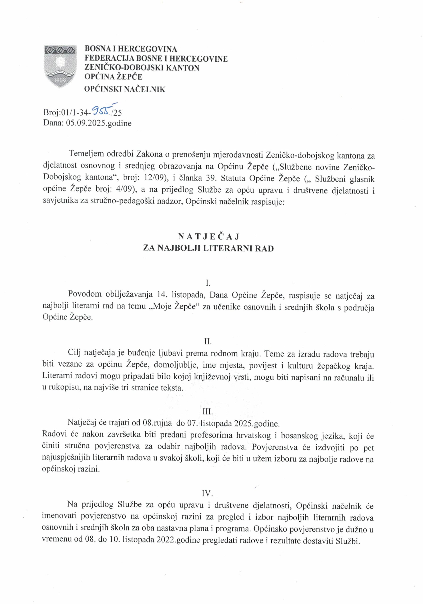 Na službenoj web stranici Općine Žepče, danas je objavljen i natječaj za najbolji literarni rad povodom obilježavanja 14. listopada, Dana općine Žepče na temu „Moje Žepče“, a koji je otvoren od 08. rujna, 2025., do 07. listopada, 2025. godine. Cijeli tekst natječaja za najbolji literarni rad možete pročitati u nastavku…….